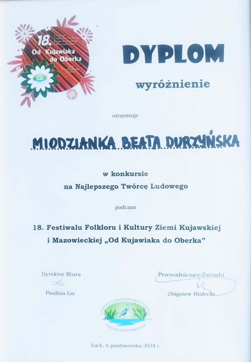 6.10.2024 r. w Łącku odbył się 18. Festiwal Folkloru i Kultury Ziemi Kujawskiej i Mazowieckiej „Od Kujawiak do Oberka” zorganizowany przez Stowarzyszenie Gmin Turystycznych Pojezierza Gostynińskiego. Festiwal upowszechnia tradycję i kulturę, promuje twórczość artystów i rzemieślników oraz jest okazją do integracji społecznej. Manufaktura Miodzianka® pierwszy raz była wystawczynią podczas Festiwalu i wzięła udział w konkursie na Najpiękniejsze Stoisko Wystawiennicze oraz Najlepszego Twórcę Ludowego. Wyjątkowe wydarzenie. Towarzyszyły nam emocje i mega pozytywna energia podczas degustacji naszych miodów. Miłym zaskoczeniem dla nas jest fakt, że Manufaktura Miodzianka® na Festiwalu otrzymała wyróżnienie w konkursie na Najlepszego Twórcę Ludowego. Stoiska Wystawiennicze i Twórców Ludowych oceniało Jury w składzie: