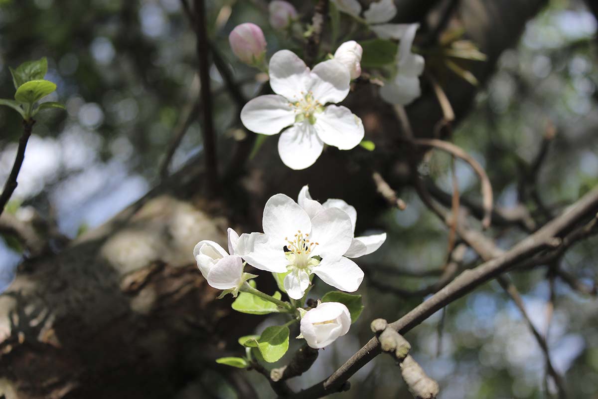 A mamy: piękną roślinność, w tym kilka wieloletnich drzew owocowych – taki nasz własny mini sad – oraz zdrowe i świeże owoce prosto z drzewa, które, chociaż nawet nie dużych rozmiarów, sprawiają nam ogromną satysfakcję, bo to nasze własne dary natury! Wśród drzew owocowych mamy jabłoń o nazwie Miodzianka Karłowa, która znacznie się wyróżniła i zachwyciła nas swoją piękną, szeroką, rozłożystą koroną, na której pierwsze kwiaty pojawiły się wczesną wiosną wraz z pączkami liści. Mały one około 3 cm wielkości, białą barwę z różowym odcieniem, który z czasem stopniowo zaniknął. Widok był niesamowity tym bardziej, iż zauważalne były i różne owady, w tym pszczoły. Zawsze się ich boimy, bo potrafią niespodziewanie boleśnie użądlić 😉😉